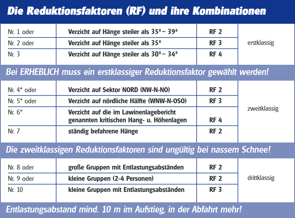 Die vom Deutschen Alpenverein angewandte Reduktionsmethode unterscheidet nach "günstigen" und "ungünstigen Expositionen: