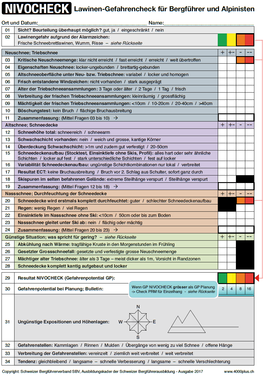 Der Nivocheck - auch Gefahrencheck genannt - ist ein Werkzeug zum selbständigen und eigenverantwortlichen Einschätzen der lokalen Gefahrenstufe. Damit ist der Nivocheck in der Phase 2 (Vor Ort) angesiedelt. Wenn die resultierende Gefahrenstufe jedoch noch mit einer Reduktionsmethode kombiniert wird, dann kann das Kombi-Pack aus "Nivocheck plus Reduktionsmethode" als ein Decision Framkework betrachtet werden.