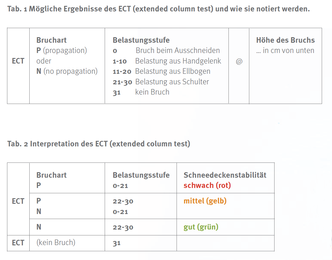 Mehr Informationen findest du in Schneedekenanalyse für Praktier (BergUndSteigen, Nr. 98). Neben dem ECT, gibt es eine ganze Reihe weiterer Schneedeckenstabilitätstest.