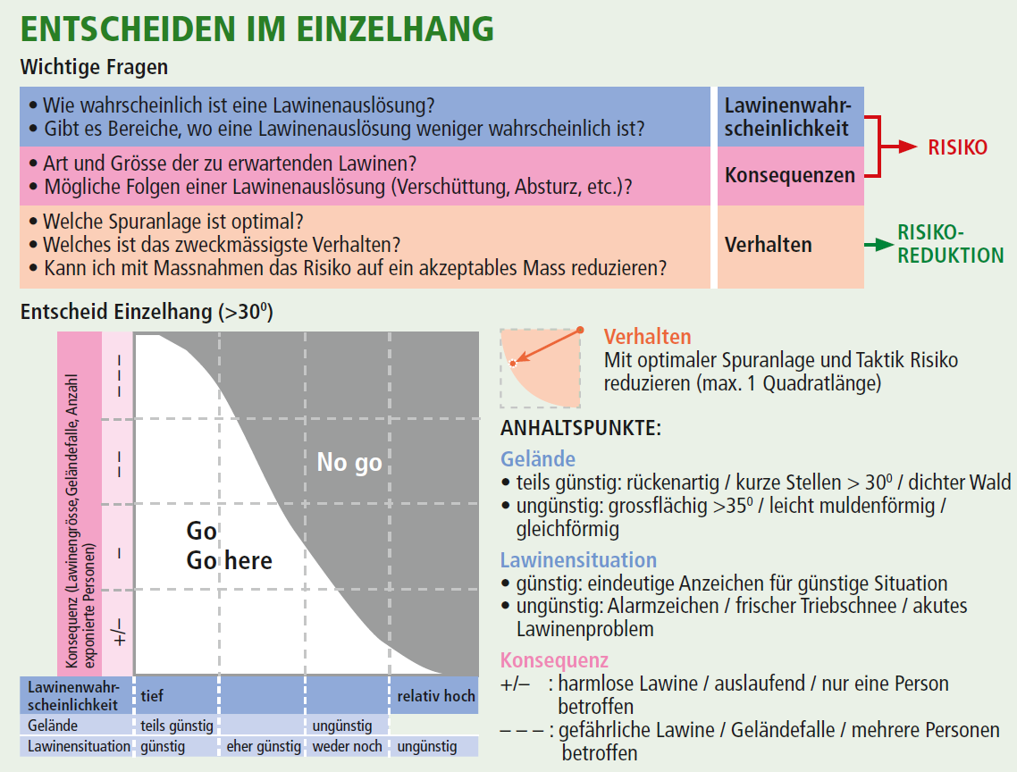 Je nach Antwort befinden wir uns im Go- oder NoGo-Bereich. Durch entsprechendes Verhalten lässt sich unter Umständen etwas Spielraum gewinnen (roter Pfeil). Eine detaillierte Abhandlung inklusive Beispielen findest du im Artikel To go or not to go des SAC-Hefts "Die Alpen" 1/2018.