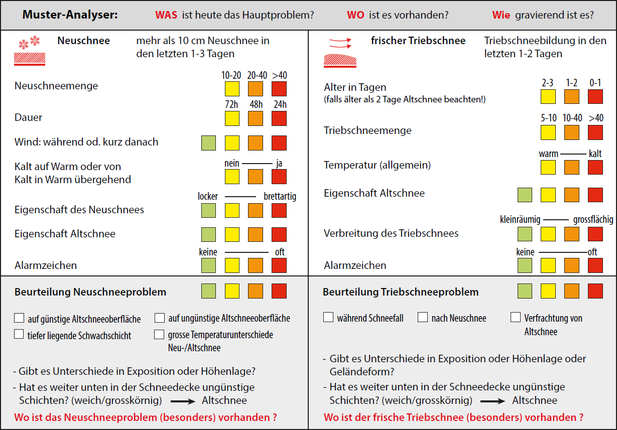 Heute spricht man von Lawinenproblemen und nicht mehr von Schneemustern. Gemeint sind folgende vier Lawinenprobleme: Neuschnee, Triebschnee, Altschnee und Nassschnee. Mit Hilfe des Muster-Analysers werden für jedes der Lawinenprobleme 6 bis 7 Fragen gestellt. Für jede Frage muss ein Kreuz gesetzt werden. Als Resultat erscheint ein vierteiliger Indikator, der farblich an den vier Gefahrenstufen angelehnt ist. Wenn die Gefahrenstufe mit einer Reduktionsmethode kombiniert wird, dann kann das Kombi-Pack aus Muster-Analyser plus Reduktionsmethode" als ein Decision Framkework betrachtet werden.