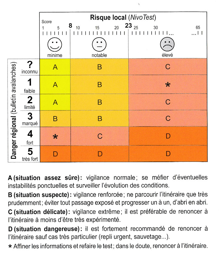 Wer möchte kann nun noch die lokale Risikoeinschätzung mit der Gefahrenstufe gemäss Lawinenbulletin kombinieren. Es resultiert eine Kategorie A, B, C oder D. Diese Kategorie kann wiederum in einen Entscheid umgemünzt werden.