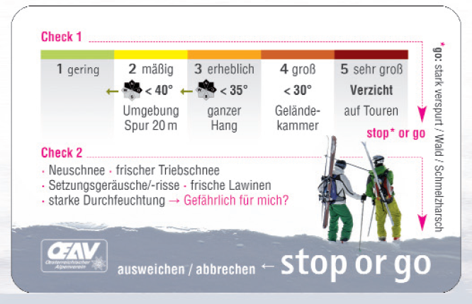 Angeregt von Werner Munters Reduktionsmethode (RM) entwickelte der Österreichische Alpenverein (OeAV) das Risiko-Mananagement-Konzept "Stop or Go". Es basiert auf zwei Checks. Der erste Check ist identisch mit der Elementaren Reduktionsmethode von Werner Munter. Der zweite Check findet im Einzelhang statt und stellt drei Fragen (siehe Bild).