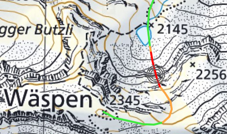 Die Identifikation von Schlüsselstellen ist ein wichtiger Schritt während der Skitourenplanung. Skitourenguru hilft dir mit den grauen Ringen solche Schlüsselstellen zu erkennen. Du bist jedoch gefordert einen kritischen Umgang mit den bezeichneten Schlüsselstellen zu finden. Hat der Algorithmus wirklich alle Schlüsselstellen erfasst? Die Neigungskarte hilft dir bei dieser Aufgabe. Während der Skitourenplanung geht es darum sich gut zu planen, was du machst, wenn du kurz vor einer Schlüsselstelle zum Schluss kommst, dass die Stelle nicht ohne untragbare Risiken zu bewältigen ist. Eine Umkehr ist immer die die naheliegende Antwort.