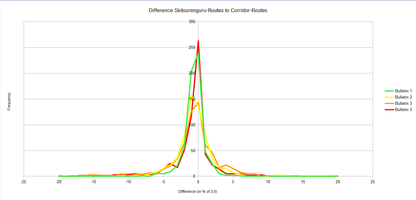 Bei diesem Vergleich wird die prozentuale Abweichung des Risiko-Indikators berechnet. Wenn also bspw. eine Originalroute bei einem spezifischen Lawinenbulletin mit 1.5 bewertet wird, hingegen bei der automatisch gelegten Route mit 1.2, dann liegt die prozentuale Abweichung bei -10 %. Es sei daran erinnert, dass der Risiko-Indikator im Bereich [0..3] liegt. -10 % von 3 ergibt die Differenz von -0.3 (1.2 - 1.5 = -0.3).